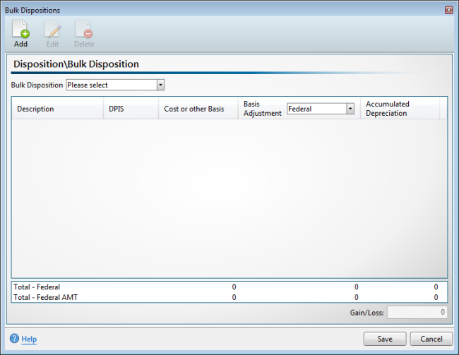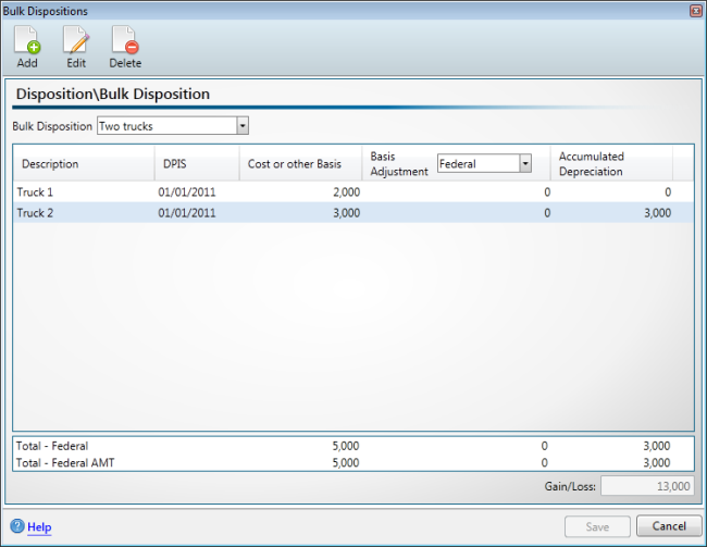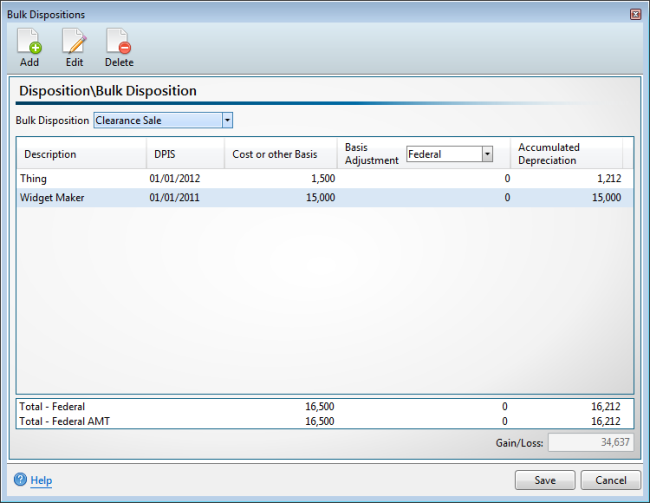 The details of each asset's disposition and the totals for all assets in the bulk disposition are displayed in the Bulk Dispositions dialog box and Gain/Loss is calculated based on the total sale.