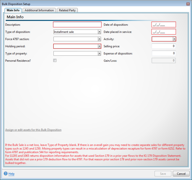 If the sale of a group of assets is to be reported on Form 4797, Sales of Business Property or Form 6252, Installment Sale Income, use the Bulk Sales feature to link the assets together into one sale with one sale price.
